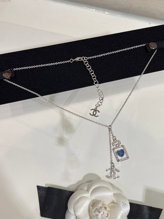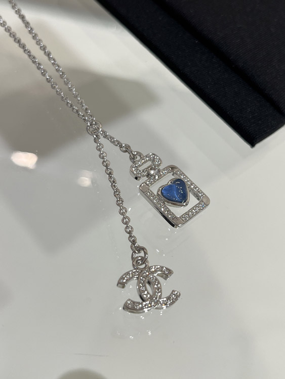Chanel blue heart silver full diamond double C perfume bottle necklace-3750